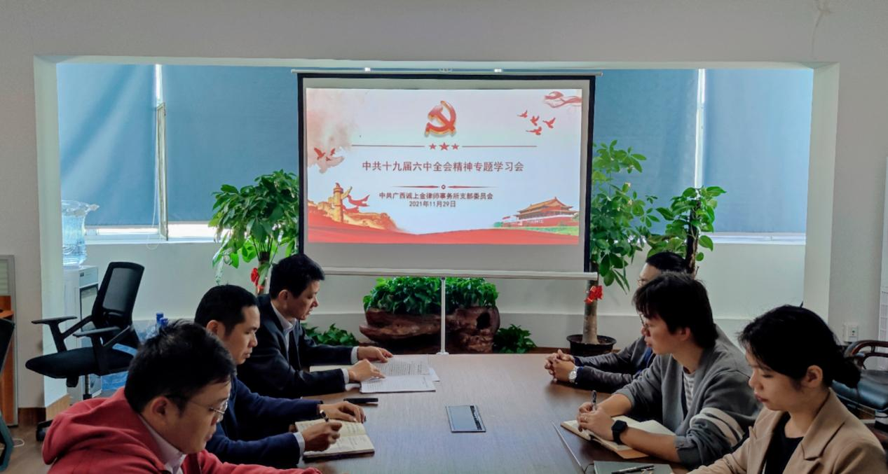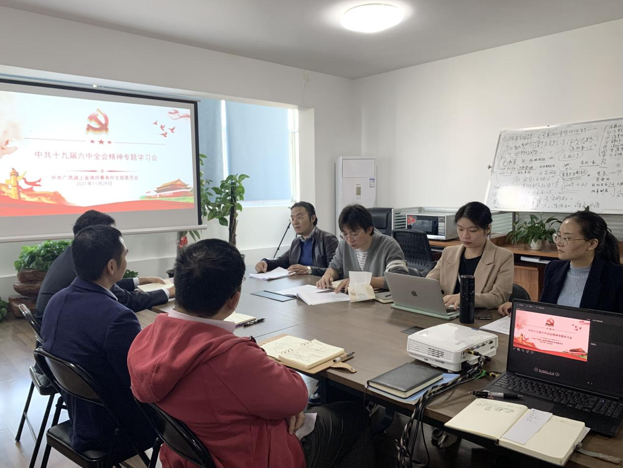 为进一步学习领会党的十九届六中全会精神,2021年11月29日,中共广西诚上金律师事务所支部委员会召开组织生活会,学习党的十九届六中全会文件精神。会议由党支部书记丁培年主持,诚上金律所支部党员、入党积极分子参加会议。