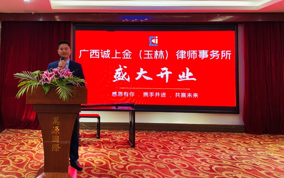 诚上金玉林分所负责人王庆波致辞 诚上金玉林分所负责人王庆波表示:“诚上金玉林分所的正式成立,意味着新的责任、新的使命、新的担当,全体诚上金人将为建设平安玉林、法治玉林、和谐玉林做出自己的贡献”。我们有信心、有实力,在今后的工作中将以最专业、最高效的服务标准为玉林的法律服务市场树立自己的标杆”。 优秀青年律师代表韦杰斌致辞 优秀青年律师代表韦杰斌表示:“作为一名刚执业的青年律师,非常荣幸,能代表青年律师在这里发言,想起我初入广西诚上金律师事务所这个大家庭,就被律所专业、团结的工作氛围所深深吸引。在这个大家庭里,我找到做律师的自信,得到了最专业的指导和系统的学习,当一年左右的实习期间结束时,我已具备独立自主办理各类型案件的能力,真正感受到诚上金律所是一所有爱、有温度、有传帮带人才培养机制的综合性律所。在此,我非常感谢律所领导以及各位律界精英对我们青年律师的精心栽培,感恩、感谢”。